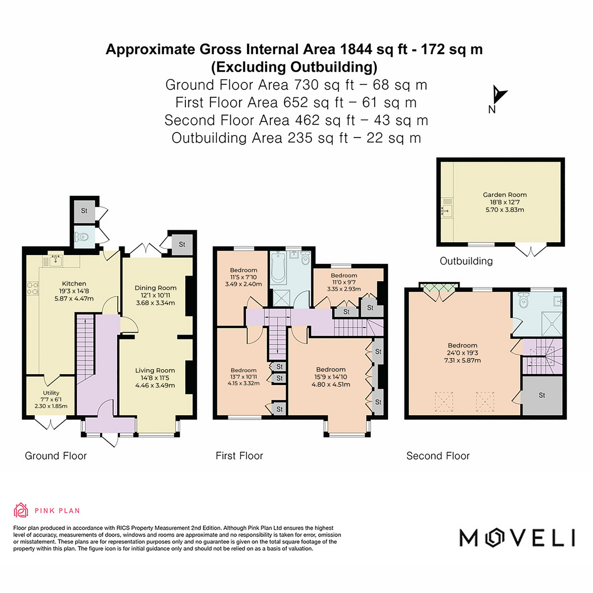 The garden features a newly laid lawn, providing a fresh outdoor space ready for family use and outdoor activities. At the far end, is a brand-new self-contained garden room, beautifully presented, fitted with electricity and a built in kitchenette - a practical area suitable for a home office, creative studio, or extra accommodation.