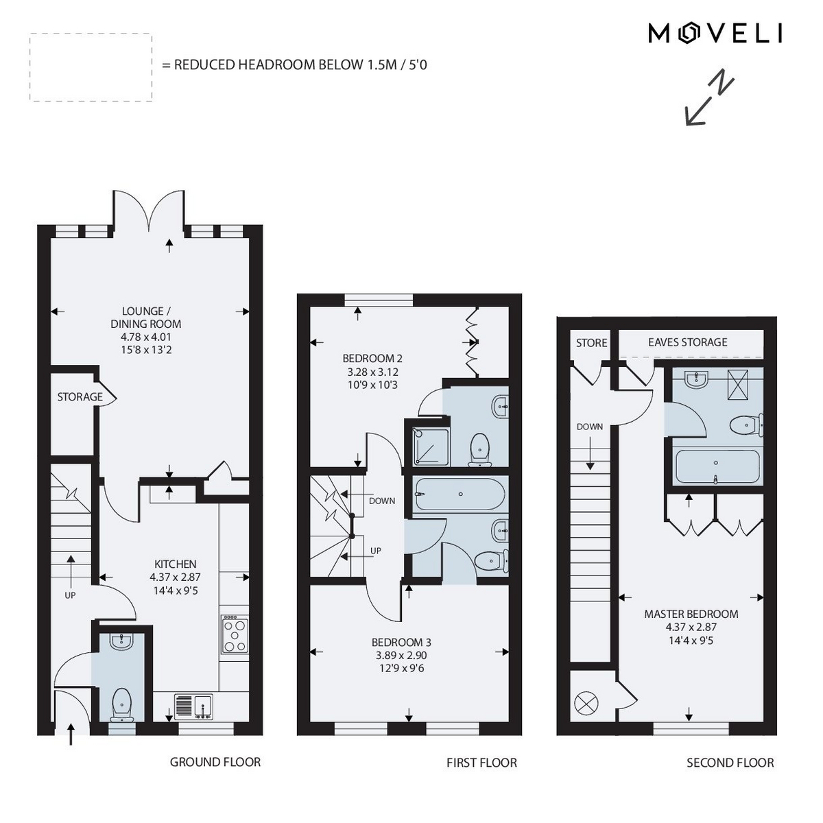 Beautifully presented and thoughtfully arranged, this three-bedroom townhouse offers well-balanced accommodation across three floors. It is ideal for modern family life or professional buyers. The ground floor opens with a welcoming entrance hall with oak flooring and a guest cloakroom. At the front, the kitchen is fitted with a range of wall and base units with worktops and tiled splashbacks, incorporating integrated appliances including a four-ring gas hob with extractor above, oven, fridge, freezer, dishwasher, and space for a washing machine. The spacious living room has double doors opening to the garden and ample space for both relaxed seating and dining. A deep understairs cupboard offers useful storage. Each of the three bedrooms is a double and benefits from en suite access. Two are positioned on the first floor, both with fitted wardrobes; one has its own shower room, the other is served by a modern Jack and Jill bathroom. The top floor is home to the principal suite with generous proportions, fitted wardrobes, eaves storage, and a well appointed en-suite shower room with skylight.