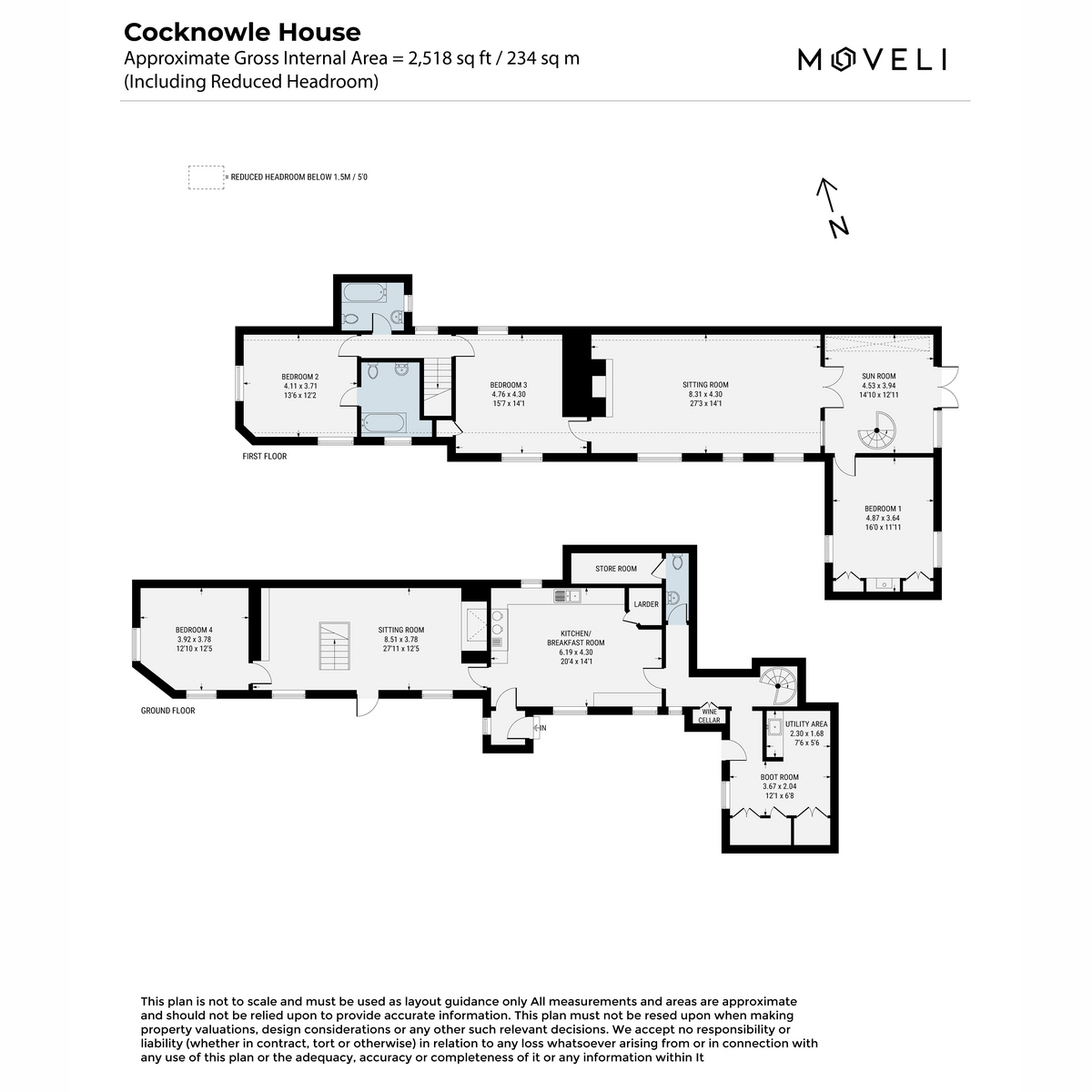 The kitchen has hand-built cabinetry, an AGA, and space for family dining, while a separate boot room, study or fourth bedroom, and two staircases add charm and practicality. Upstairs, the principal bedroom has a vaulted ceiling and en suite bathroom, complemented by two further doubles and a family bathroom. A first-floor sitting room with oak flooring and a wood-burning stove opens into a bright sunroom, taking full advantage of the spectacular valley views.